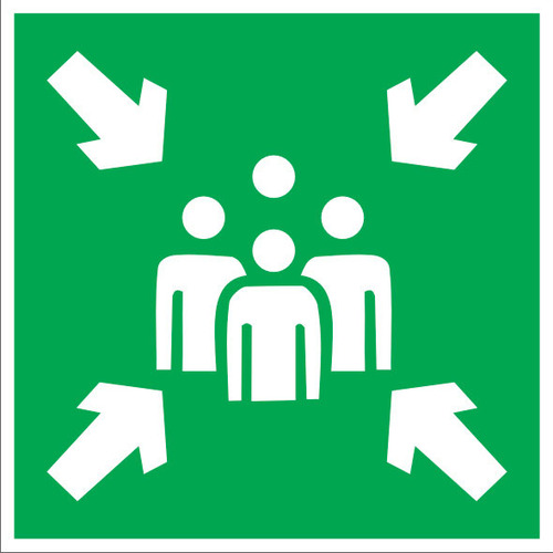 На дверях, стенах помещений и в других местах для обозначения заранее предусмотренных пунктов (мест) сбора людей в случае возникновения пожара, аварии или другой чрезвычайной ситуации |